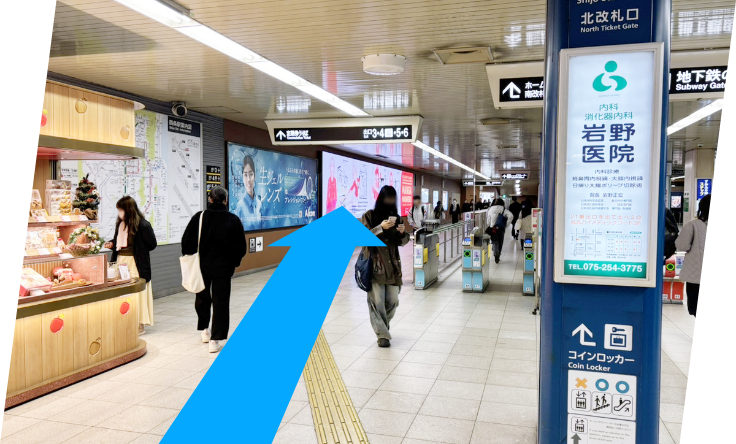 四条駅改札付近をさらに奥へ通過し、4番出口を目指します。 -